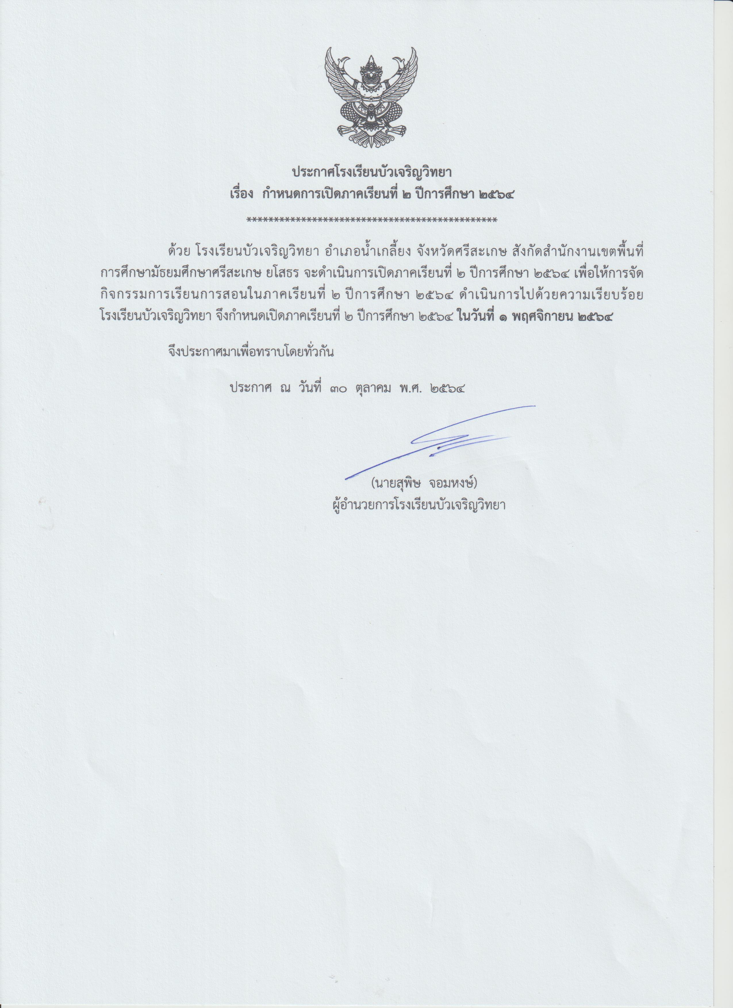 ประกาศโรงเรียน เปิดภารเรียนที่ 2 ปีการศึกษา 2564